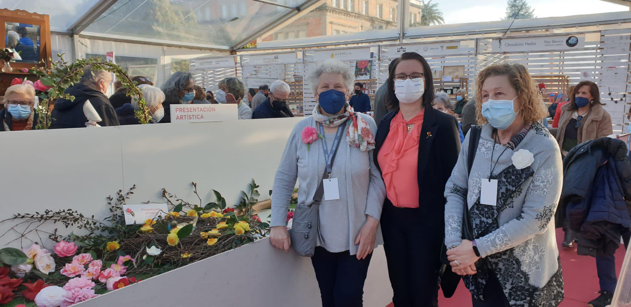 Cristina y Mara ante el conjunto floral premiado acompañadas de la concejala Coordinadora de Actividades Culturais del Concello de Marín, Itziar Álvarez que acudió a felicitarlas