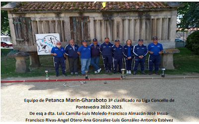 MARÍN. 19.05.2023. Rematada a Liga de Petanca Concello de Pontevedra o club Gharaboto de Marín fai resumen da su actividad como participante entre trece equipos de diferentes lugares, e na que acadaron o cuarto posto. Nestes dous últimos anos o Gharaboto de Petanca xogou ademáis da Liga e Copa de Pontevedra torneos en Cangas, Moaña e Bueu sendo campión en Bueu e cuarto finalista en Cangas. En canto a Chave o club marinense participou no torneo de Seleccións do Morrazo. Respecto a actividade en Mrín do ano 2022, o presidente, Luis Camiña manifesta que foi “unha mágoa non poder celebrar o Torneo de Petanca nas Festas do Verán por falta de campos ao ter que levantalos polas obras do Auditorio. Agardemos que pronto se fagan os campos en Marín para deixar de ter que xoga fora.
